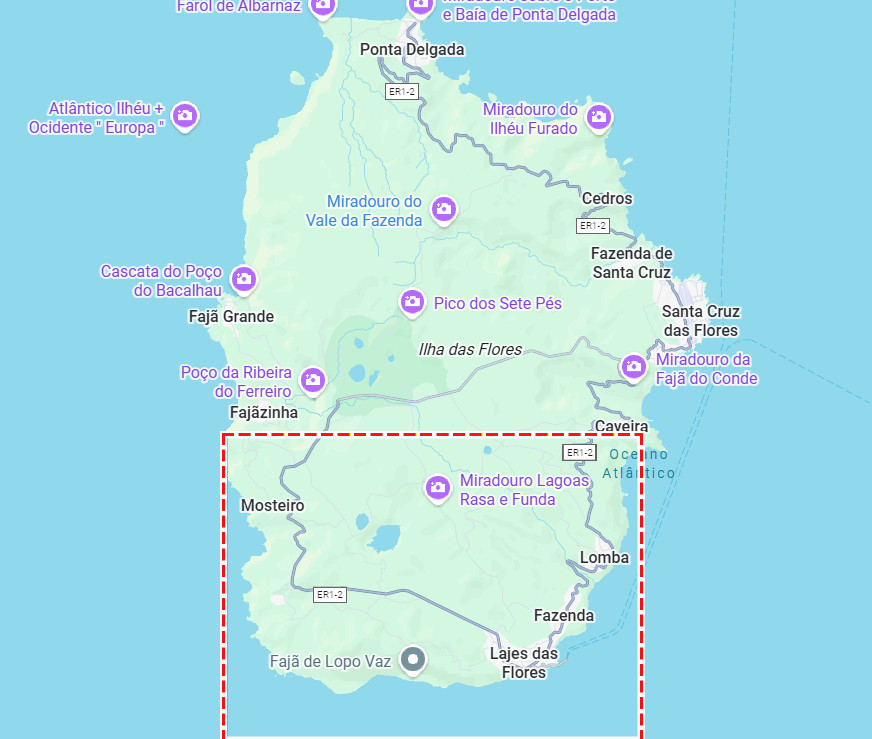 Hier ist ein Tourvorschlag für den wilden Norden von Flores. Diese Route führt dich zu den entlegensten Punkten der Insel, mit spektakulären Ausblicken auf die Nachbarinsel Corvo und die raue Nordküste.